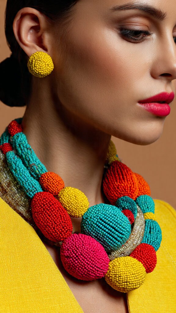 Bold, oversized beads in vibrant shades are dominating current trends. These necklaces instantly become the centerpiece of any outfit and work best when paired with neutral clothing.