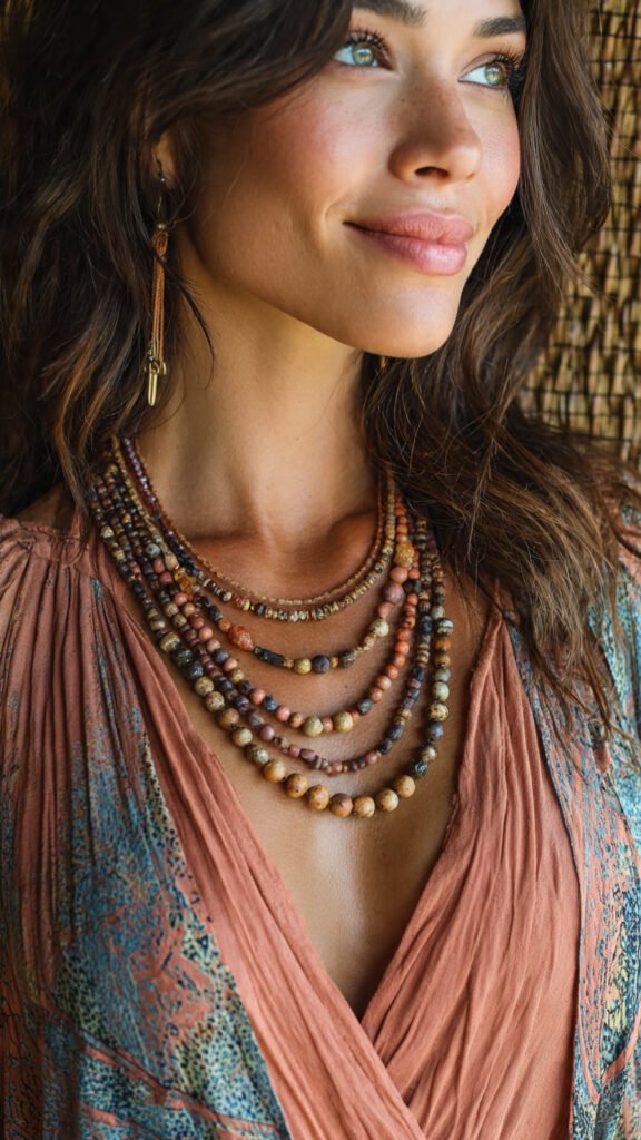 Layered strands featuring natural stones, wooden beads, and earthy tones create a relaxed, boho-inspired vibe. These are perfect for casual outfits and travel looks.
