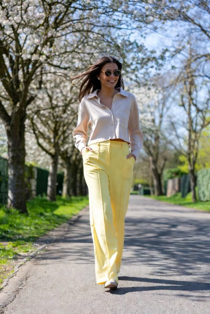 High-waisted wide-leg trousers paired with a cropped top create a flattering silhouette that feels modern and relaxed.
