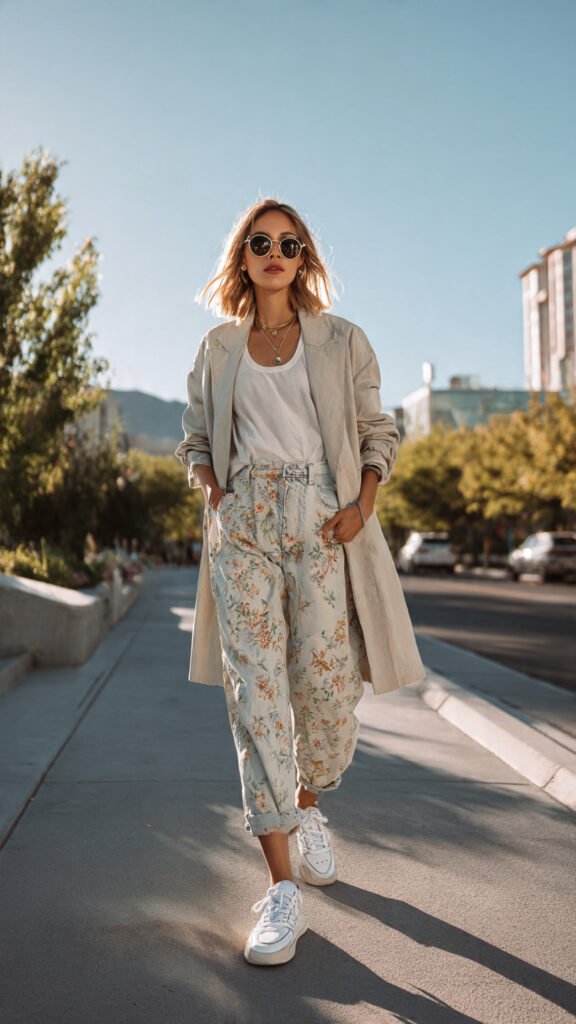 A clean pair of straight-leg jeans paired with a cropped trench or utility jacket creates a polished yet relaxed look. Add a simple tank or fitted tee underneath.
