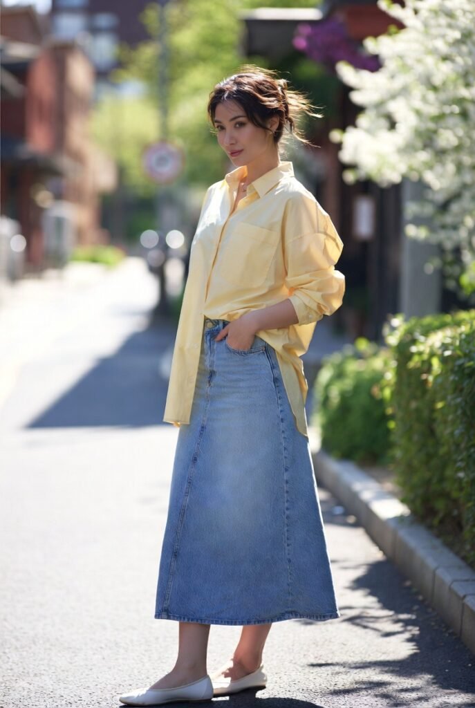 A midi or maxi denim skirt feels fresh for spring. Pair it with an oversized button-down shirt, slightly tucked for that undone aesthetic.