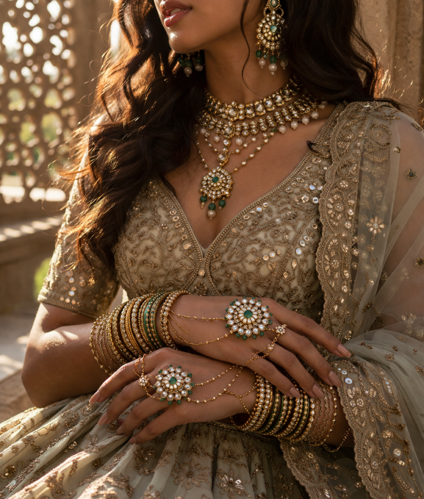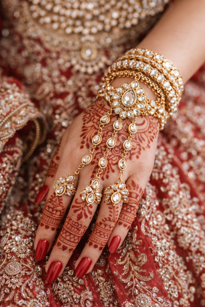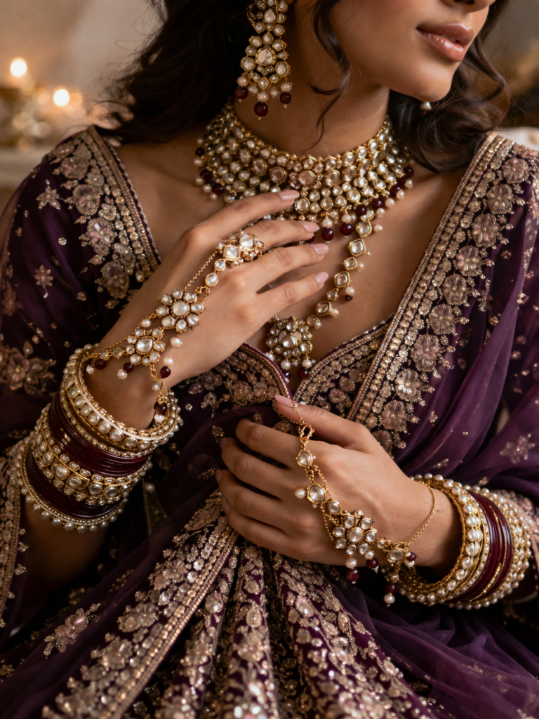 A heavily embroidered or worked bridal lehenga calls for a Kundan or Polki hath phool of commensurate weight and intricacy. In this context, the guiding principle is coherence: the metalwork, stone palette, and motif vocabulary of the hath phool should align with the rest of the bridal set, which typically includes a matching necklace, maang tikka, and earrings. The hath phool should be allowed to function as a statement piece within the composition of the hand — which means avoiding the temptation to over-ring the fingers, as the chains and central medallion already provide sufficient visual complexity. Statement bangles in a complementary material — Kundan, gold, or polki — can be worn on the opposite wrist to balance the composition.
