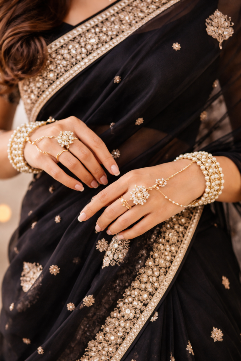 The saree, with its flowing silhouette and varying degrees of embellishment, accommodates a wide range of hath phool styles. For organza or georgette sarees in soft, pastel tones, a pearl hath phool is the natural choice, its tactile softness echoing the fabric’s drape and its warm lustre complementing the subtle sheen of the cloth. For heavily worked Banarasi or Kanjeevaram silk sarees, a Kundan or Polki hath phool can hold its own against the textile’s complexity. In both cases, neutral nail colour — soft nudes, creams, or pale pinks — allows the ornament to read clearly against the skin, and dainty stacking rings on other fingers can be added sparingly without competing with the hath phool’s central visual function.
