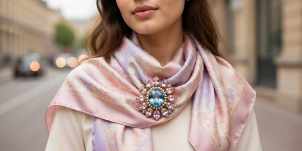 Scarves and brooches create a natural pairing. The brooch not only secures the fabric but also adds a focal point.