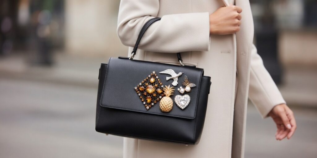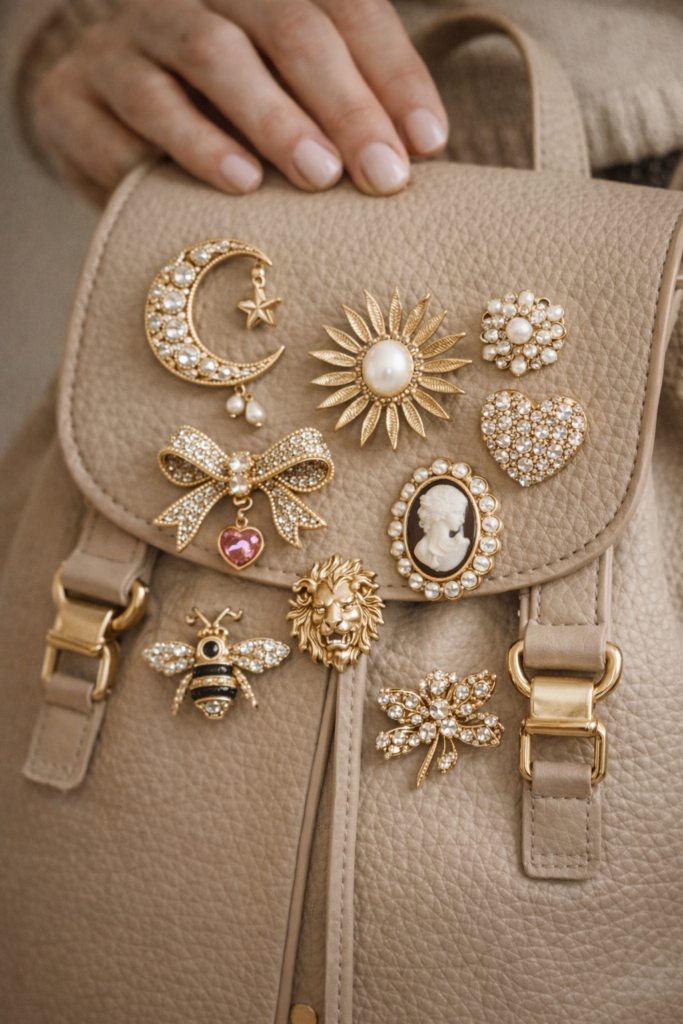 Adding a brooch to a structured bag instantly personalizes it, giving even the simplest design a unique identity. This styling approach aligns with the growing trend of customization in fashion.