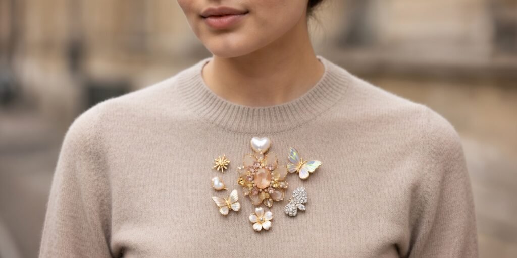 Pin a brooch near the collarbone on a fitted knit for a subtle accent, or cluster smaller pieces across the chest for a more expressive, Pinterest-driven look.