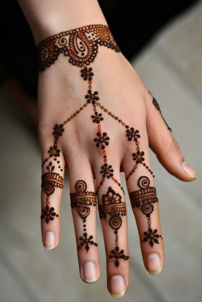 • Finger chain mehndi (haath phool style)