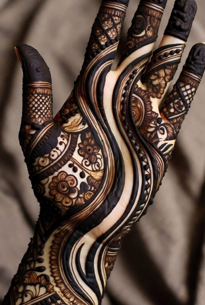 If you’re searching for trending Eid mehndi designs that look elegant in pictures, this is the one. It’s dramatic without being overwhelming, and stylish without trying too hard.