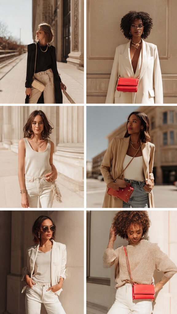 Neutral outfits allow the bag to stand out without distraction. Black, white, beige, cream, and soft earth tones act as a clean canvas that naturally draws attention to the bag.