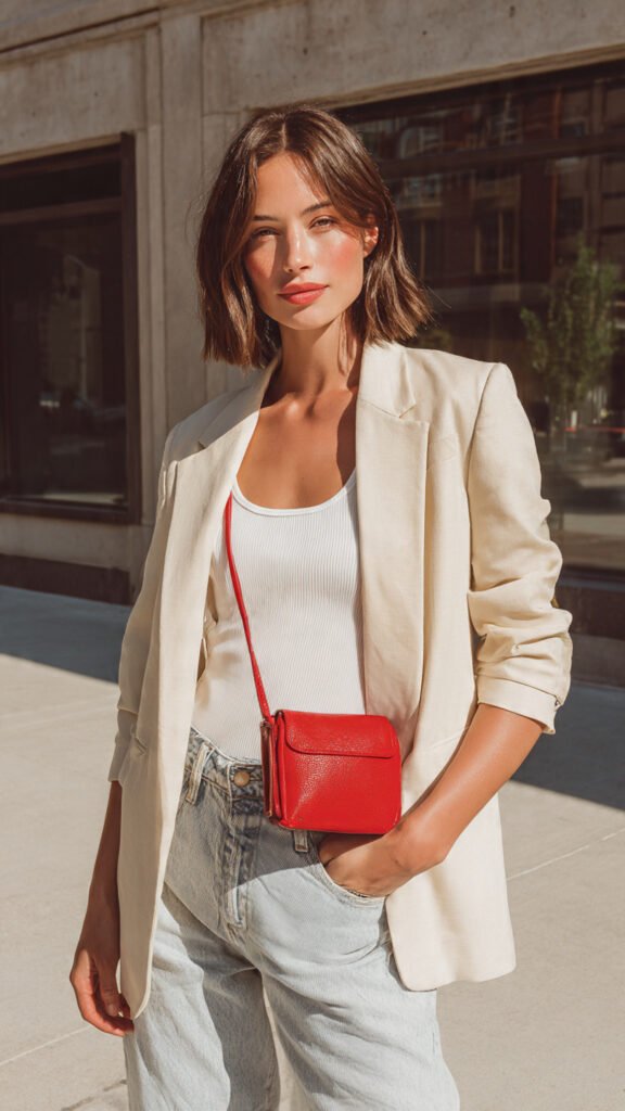A beige blazer with a white tank and straight-leg jeans feels polished on its own. Add a bright red micro bag, and suddenly the outfit looks styled, curated, and content-ready.