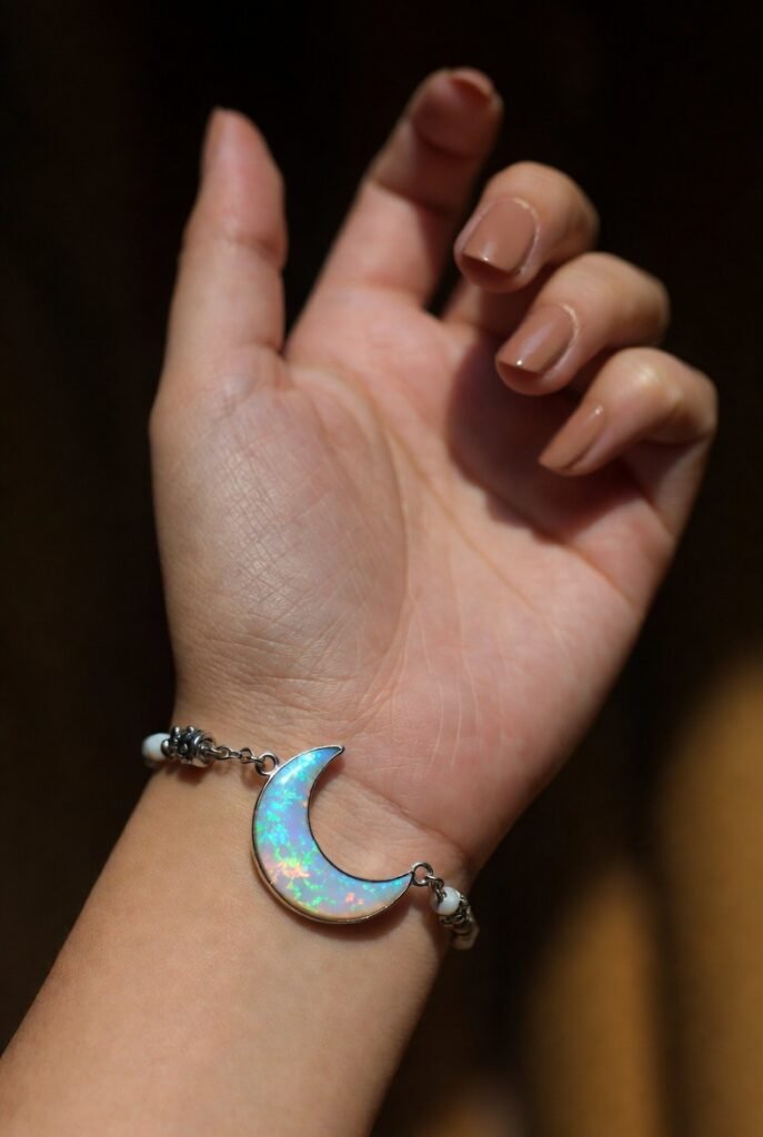 Opal is one of the most defining elements of this trend. Known for its luminous, color shifting glow, opal stones reflect shades of blue, pink, and soft gold depending on the light. This natural shimmer gives celestial bracelets a dreamy quality that feels elegant without being overwhelming.