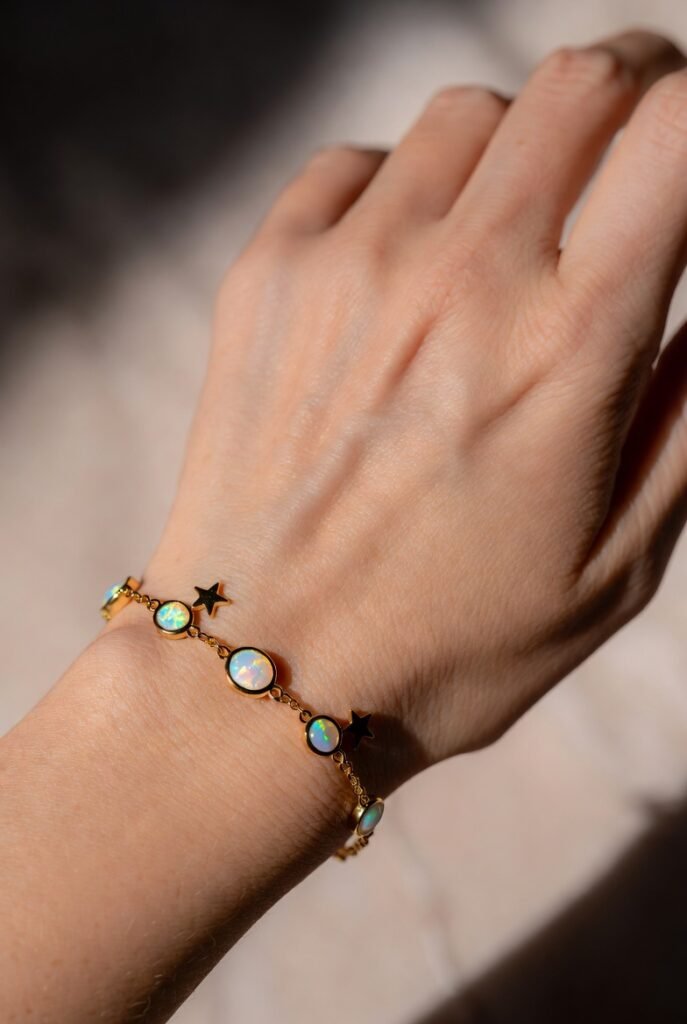 The opal star bracelet combines tiny star shaped charms with luminous opal stones. The soft glow of the opal paired with delicate gold stars creates a piece that feels light, feminine, and effortlessly elegant. This bracelet works beautifully for everyday wear and adds a gentle sparkle to simple outfits such as linen dresses or minimalist tops.