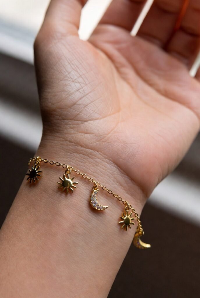 Few designs feel as symbolic as the sun and moon bracelet. Featuring tiny sun and crescent moon charms, this style represents balance and harmony. These bracelets often come in polished gold finishes with small crystals or opal accents that catch the light beautifully. They are perfect for layering with other delicate jewelry and instantly give an outfit a celestial inspired aesthetic.